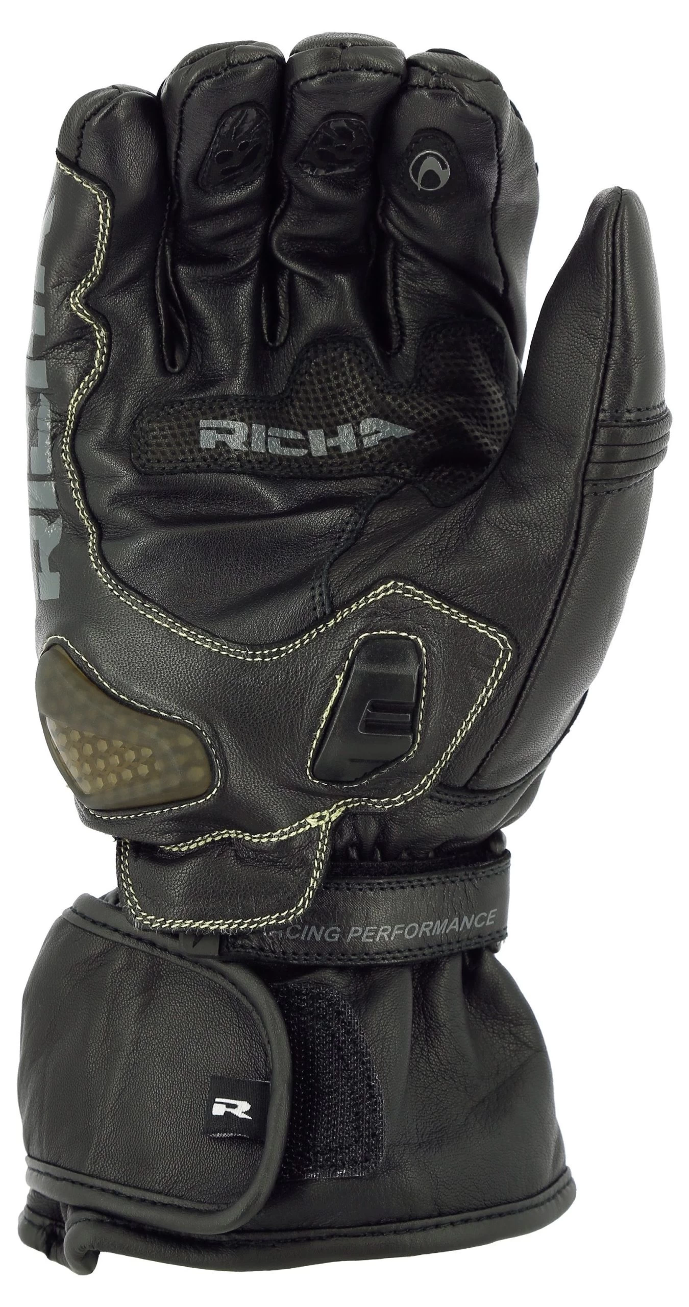 Om optimale slijtvastheid te kunnen bieden heeft Richa gebruik gemaakt van hoogwaardig leer wat op de meest kwetsbare delen waaronder de pinkzijde van de handschoen met twee lagen is aangebracht. Op de pols, vingers en knokkels heeft Richa harde protectoren verwerkt welke optimaal dienst doen in geval van een valpartij. De sluiting is voorzien van twee klittenband straps, ronde de pols en op de manchet om goed aan te kunnen sluiten op een motorjas.